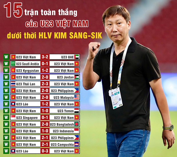 Kể từ khi tiếp quản ghế nóng của U23 Việt Nam, HLV Kim Sang-sik đã thắng cả 15 trận đấu chính thức trên mọi đấu trường. |
