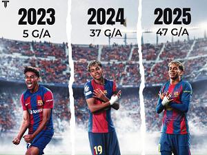 Kể từ khi lên đội một Barca năm 2023, thành tích ghi bàn và kiến tạo của Lamine Yamal tăng chóng mặt qua mỗi năm. |